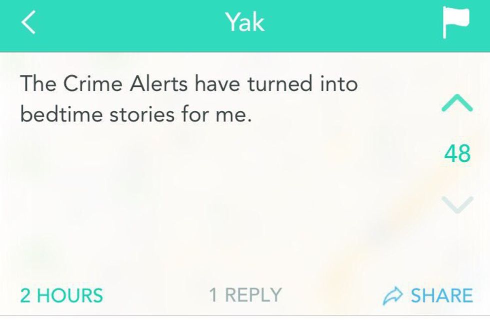 It's perfectly normal to get a crime alert in the middle of the day, too. Surprisingly, I haven't gotten one in a while.