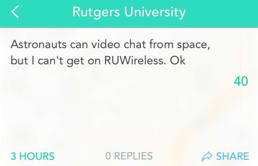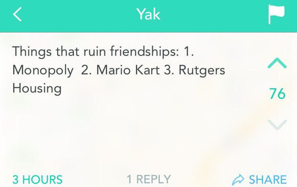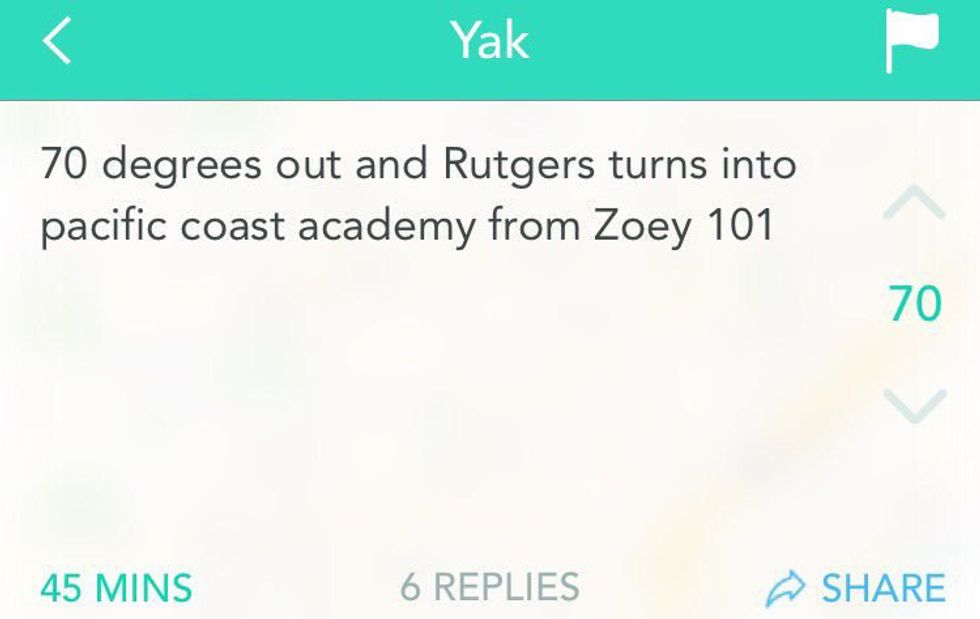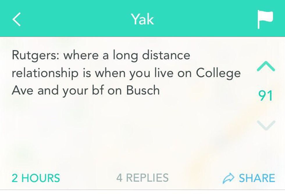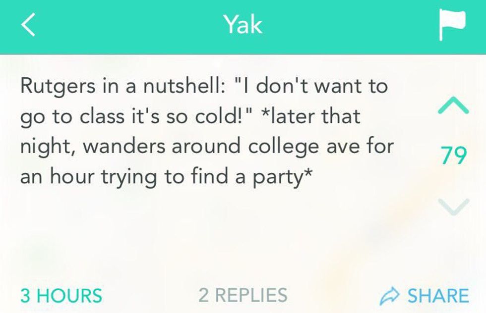 I'm not a user of the Yik Yak app (due to not having enough data on my phone to download it), but I definitely try to keep up with what people are saying on campus. For those of you who don't know what Yik Yak is, it's an app where people can anonymously post and create discussions with people within the same five-mile radius. You can like and dislike posts without people knowing who you are. People post a lot of irrelevant things on Yik Yak, but every once in a while, someone says something that makes me laugh. I follow the Rutgers Yik Yak account on Twitter to see what's going on. According to this page, Rutgers University is the seventh most active campus on Yik Yak in America in 2015.