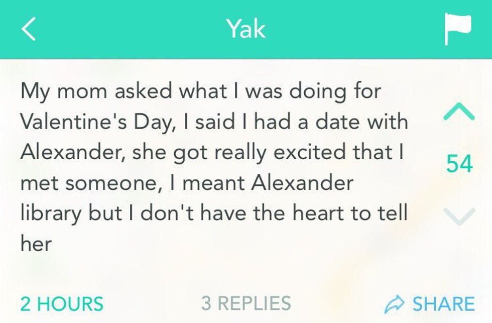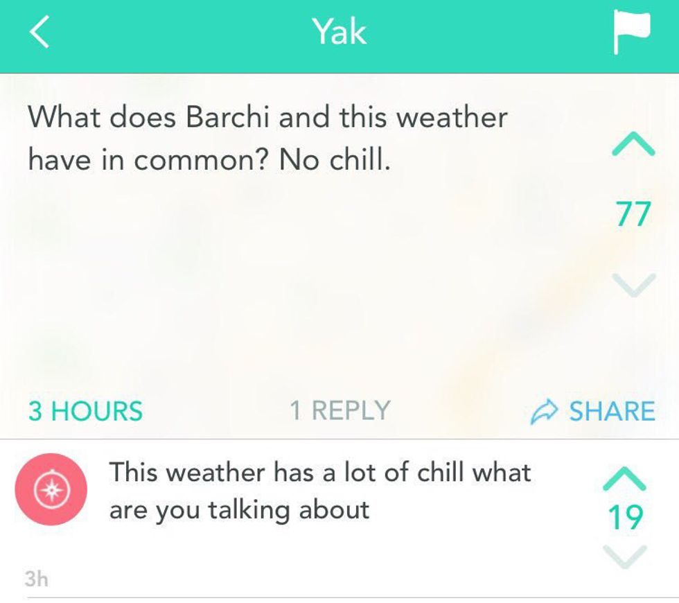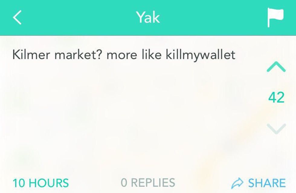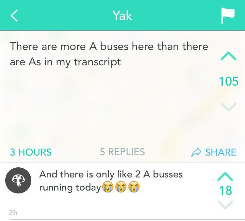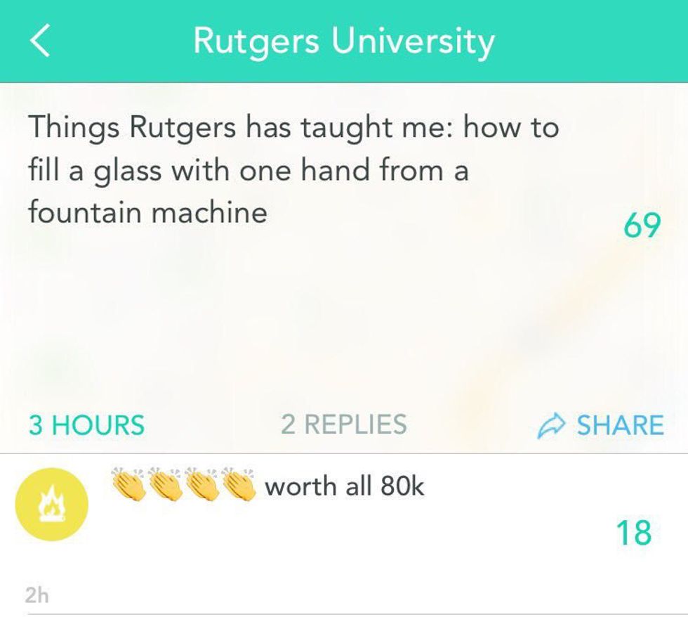 I'm not a user of the Yik Yak app (due to not having enough data on my phone to download it), but I definitely try to keep up with what people are saying on campus. For those of you who don't know what Yik Yak is, it's an app where people can anonymously post and create discussions with people within the same five-mile radius. You can like and dislike posts without people knowing who you are. People post a lot of irrelevant things on Yik Yak, but every once in a while, someone says something that makes me laugh. I follow the Rutgers Yik Yak account on Twitter to see what's going on. According to this page, Rutgers University is the seventh most active campus on Yik Yak in America in 2015.