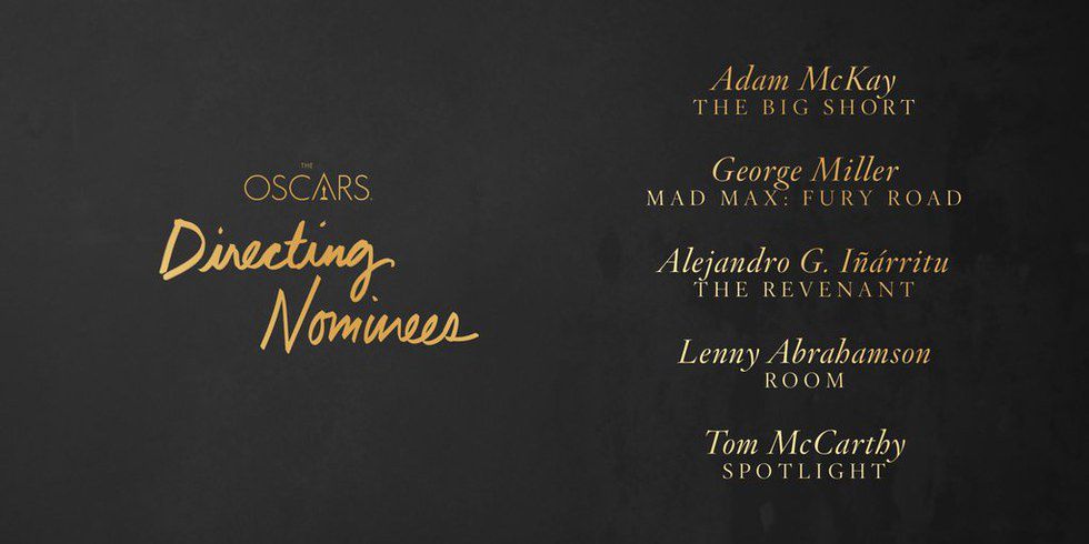 Firstly, I would like to say that a certain someone in this category proves that literally anything is possible. Adam McKay, director of "Anchorman: The Legend of Ron Burgandy," "Step Brothers," and "Talladega Nights: The Ballad of Ricky Bobby" has been nominated for the best director Oscar for his film, "The Big Short." It is well-deserved as the film is one of the best of the year and nominated in four other categories. George Miller earned a nod for "Mad Max: Fury Road," which has 10 nominations overall, only second to "The Revenant," which has 12. Unfortunately for "Mad Max" fans, I believe that Alejandro González Iñárritu will win the best director trophy for the second year in a row. His success with last year's "Birdman (or The Unexpected Virtue of Ignorance)" allowed him to make "The Revenant" and he will be amply rewarded. Fingers crossed the presenter knows how to pronounce his name.