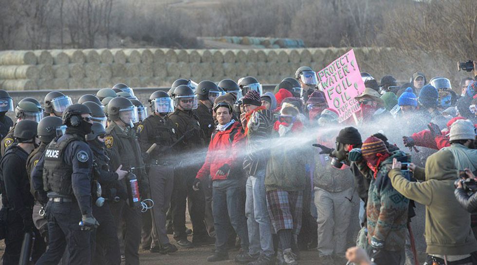 Protestors called "The Water Protectors" are sprayed with water as they protest The Dakota Access Pipeline.