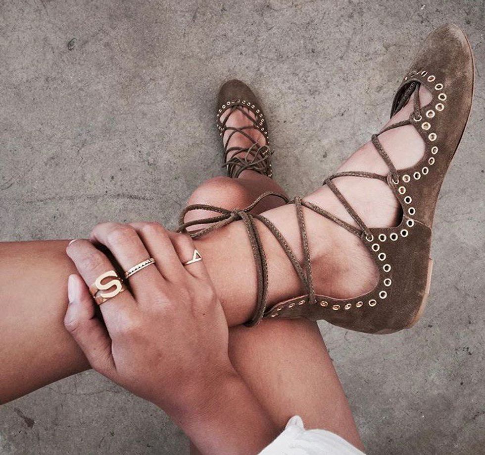 Lace up tops have become quite the fashion statement these past few months. Something as simple as a black lace up shirt is the perfect necessity for a simple, yet stylish occasion like Olivia Holt showed us at Coachella while pairing it with a cute high-waist denim short. Not only are we dealing with lace up at the top, but also it’s following us to the bottom. Lace up sandals, espadrilles, and other shoe styles are incorporating the tie up option and I love it.