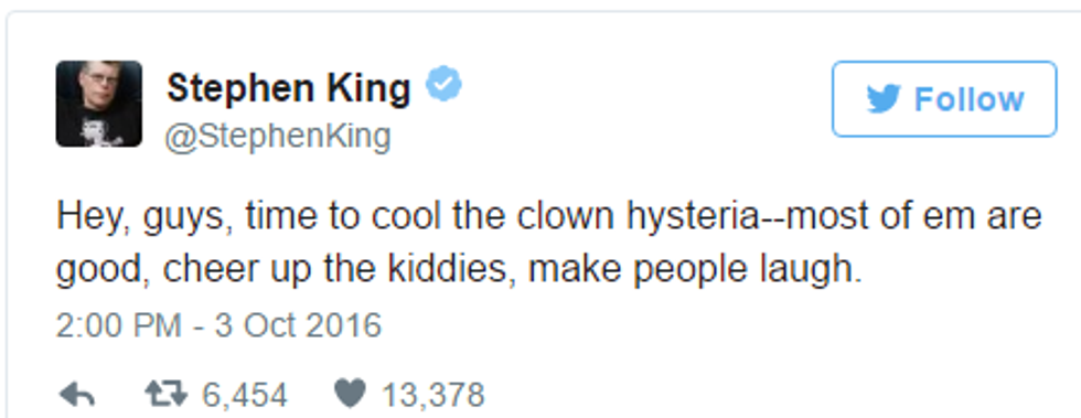 If you were excited for Halloween, you might want to change your views real quick. So many families are slowly deciding this year to not trick-or-treat because of the Year of The Clown. It is getting out of control. Clowns have been seen lurking in the woods. They have been seen trying to lure children. Some have been said to be super dangerous involving guns and knives and trying to murder victims. Although some people have also reported clown sightings and after police show up, there are no clowns seen anywhere. So, the question beginning to be asked is whether there was really a clown sighted even in the beginning. And sometimes, people believe it’s a stunt. It’s a movie promotion for Stephen King’s "It." Even Stephen King has said to cool it! It has nothing to do with the movie.