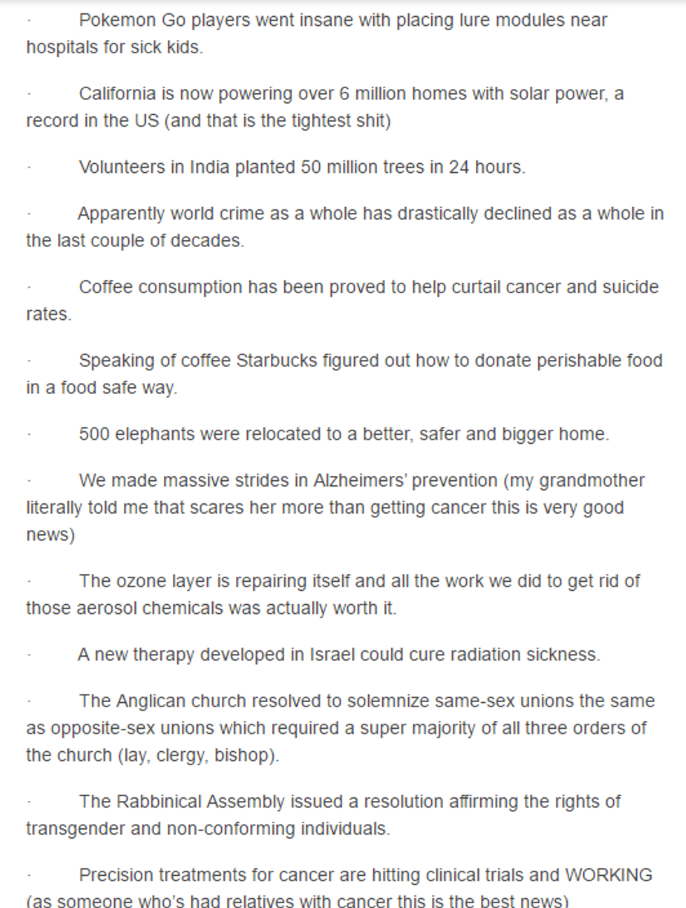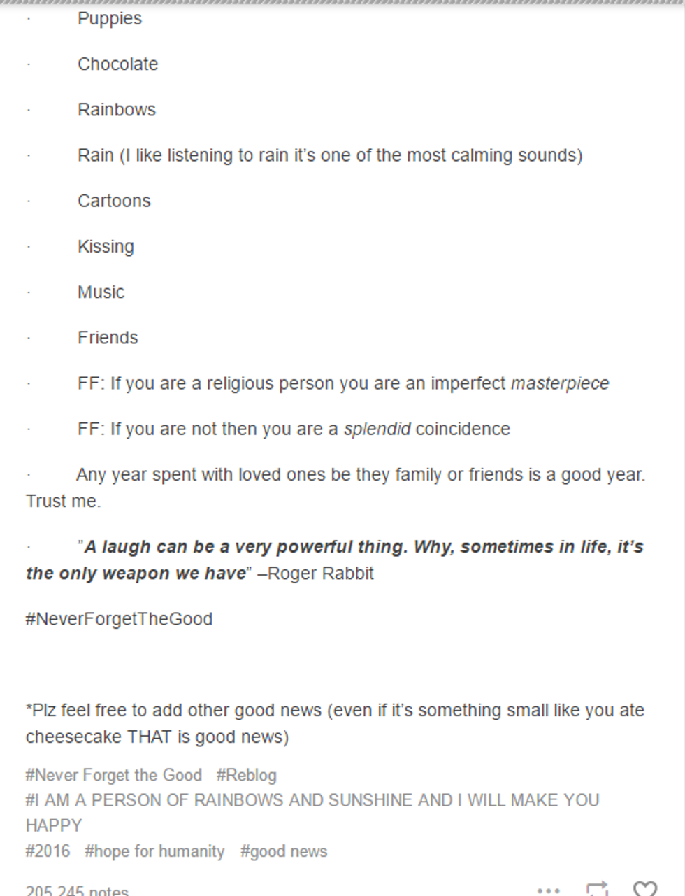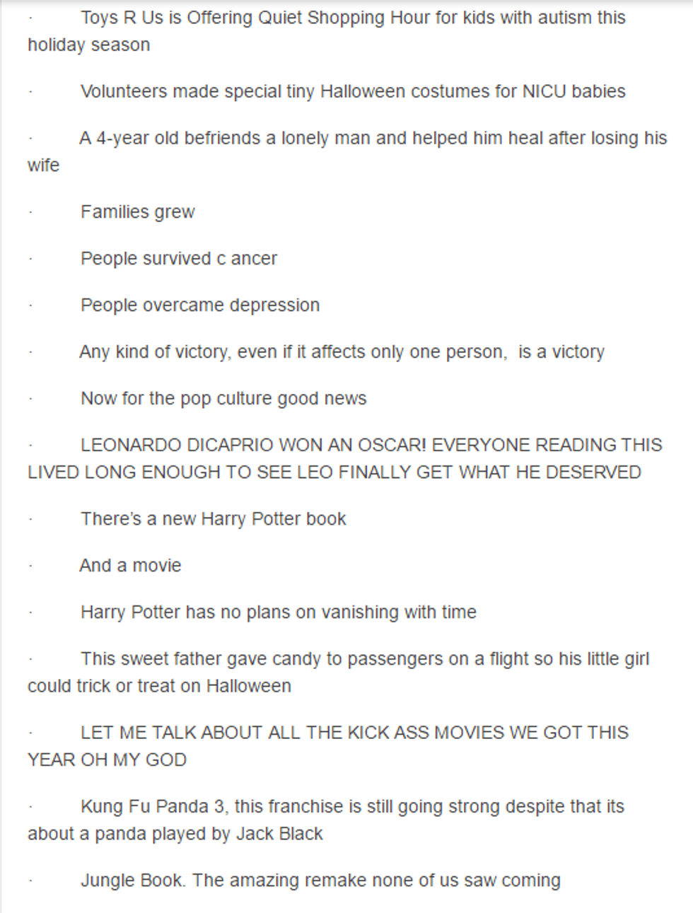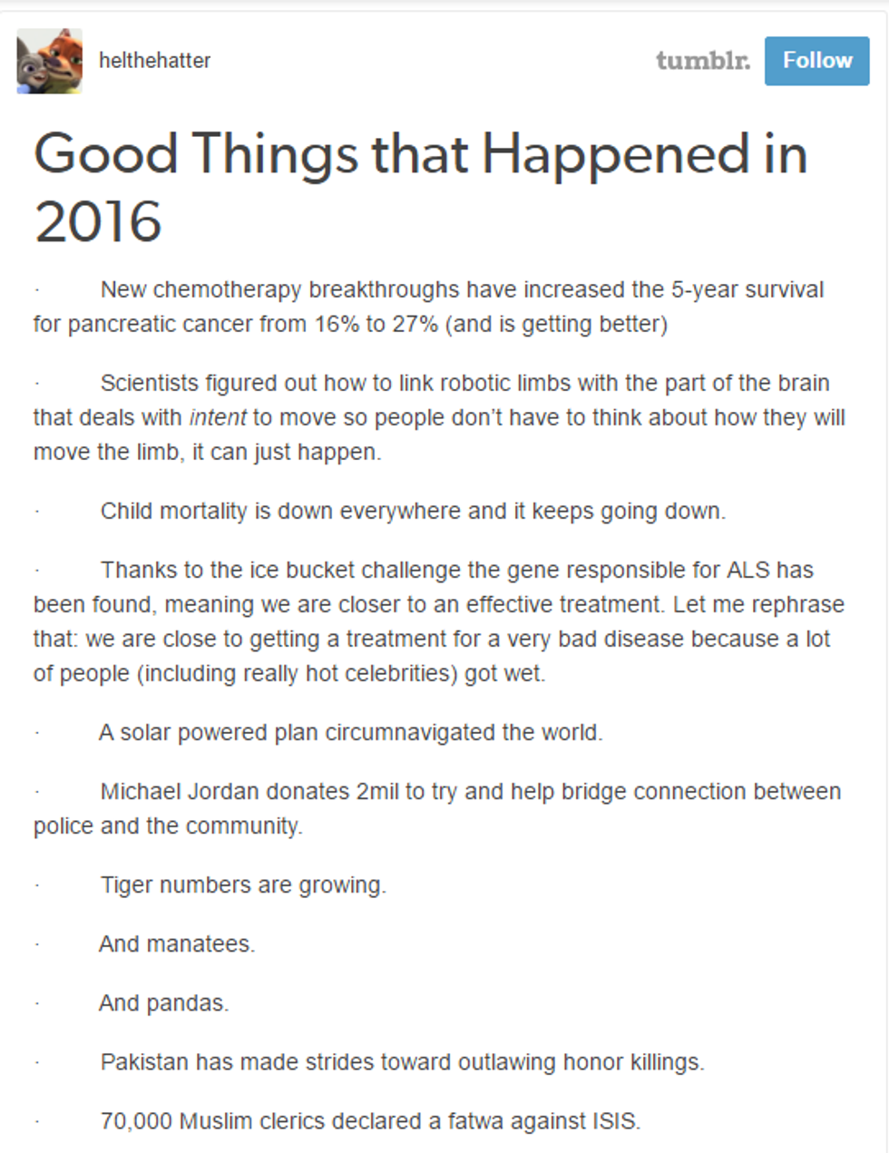 Tumblr user helthehatter put together a list of over 60 good things that happened in 2016. Over 60! That's something to smile about. Remember, there's always good left in the world if you're only willing to look hard enough.