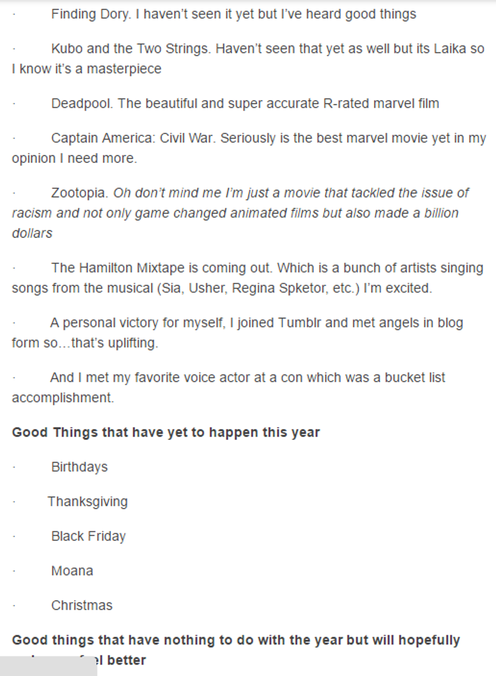 Of course, this is not to say that people's feelings aren't valid when they get upset over the events of 2016. But writing off the whole year? Saying that you wish 2016 never happened, that not a single good thing happened all year?