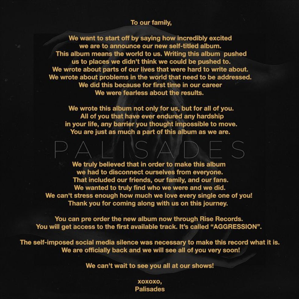 Rise Records' Palisades have returned with the announcement of their self-titled record—to release Jan. 20. Palisades succeeds 2013's Outcasts and 2015's Mind Games. Pre-order the new album here.