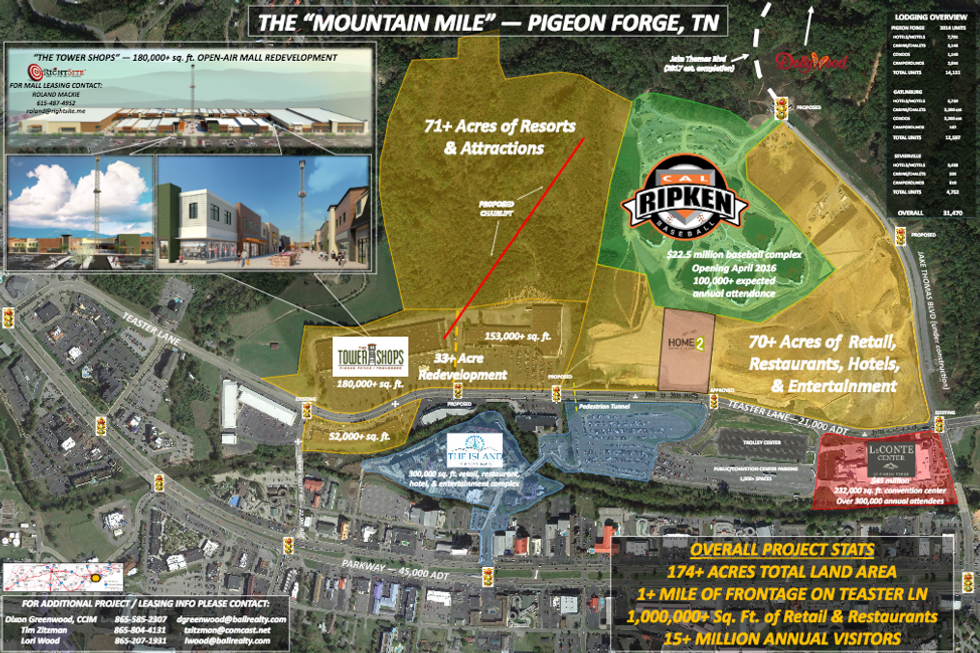 The Mountain Mile Shopping Center is currently under development in Pigeon Forge. Boasting 1 mile of store frontage and over 1 million square feet of retail space, when completed, it will be the premiere shopping destination in the Smokies. The project will also feature restaurants, live theatre options, lodging, a ski resort and so much more. The project site will feature a total redevelopment of the current shopping center along Teaster Lane that is approximately 153,000 square feet. An additional 71 acres of attractions will be added in one phase with a second phase adding an additional 70 acres of development. The total size and scope of the project will make it the second largest single-site entertainment complex in the Smokies, after Dollywood. Coincidentally, the back edge of the property will sit mere feet away from the Dollywood property line. The Cal Ripken Experience is already open during the initial pre-development phase. For more information, visit www.mountainmilepigeonforge.com