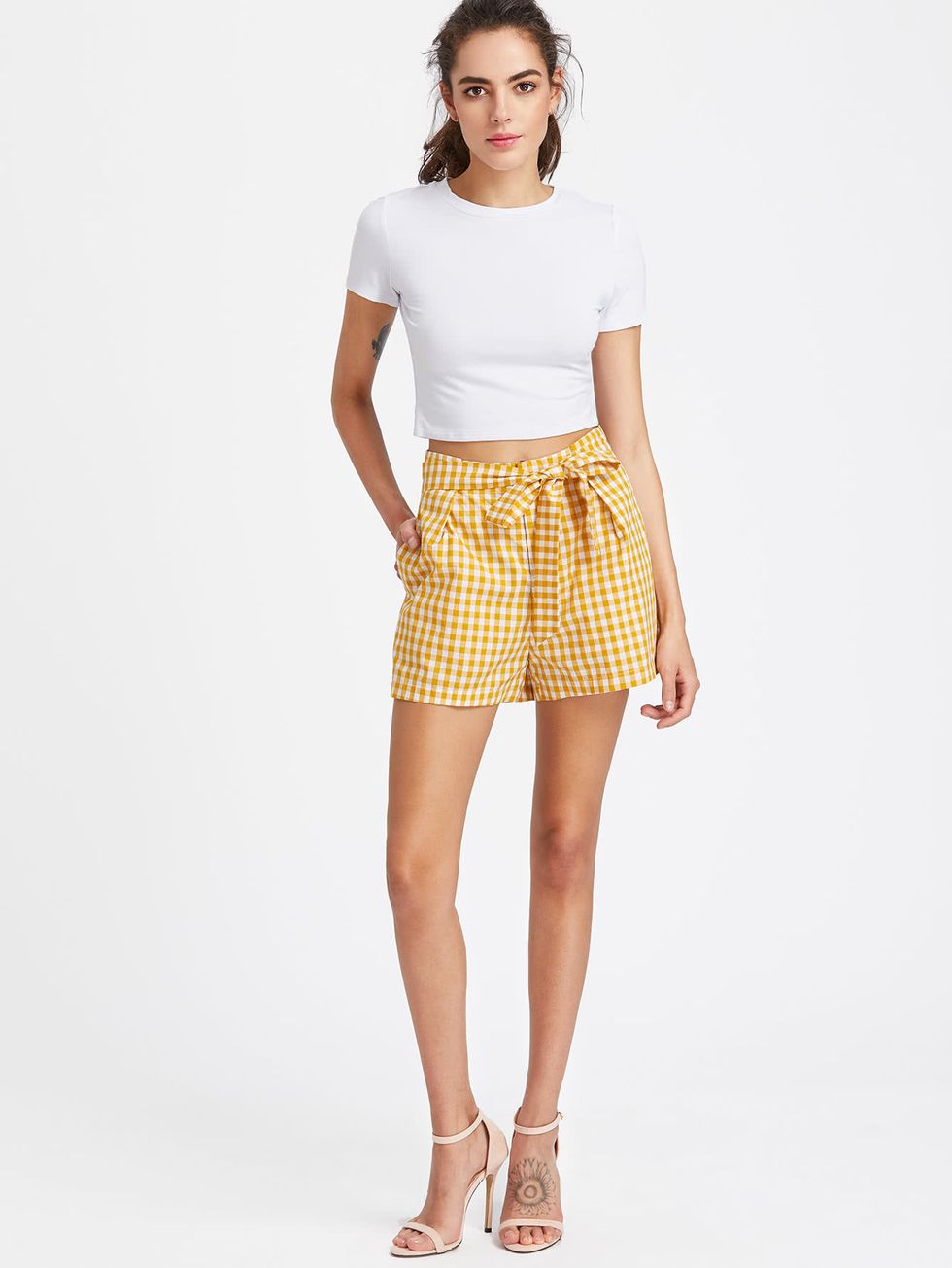 (Self Belt Wide Leg Gingham Shorts, Romwe)