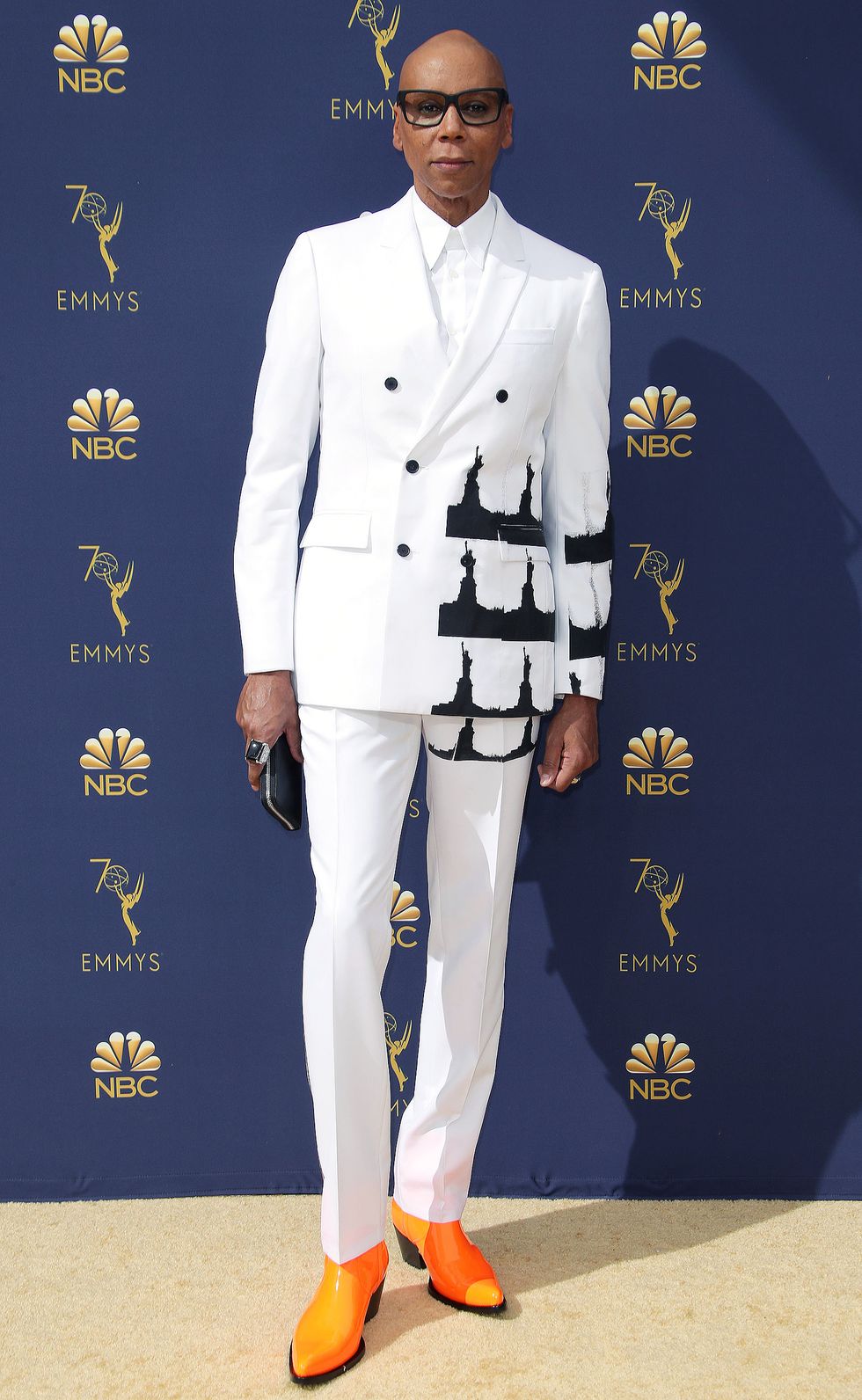 Rupaul added his own style into the night with this custom-made Calvin Klein suit, and he completed the look with his statement orange shoes.