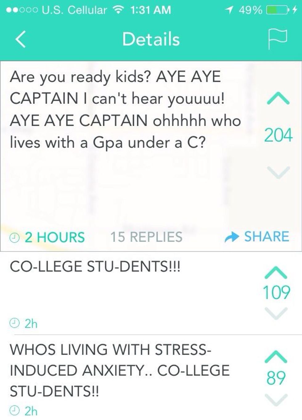 Everyone, I wish you the greatest luck on all your finals, whether you're in high school or college or middle school -- I don't know. Just good luck.