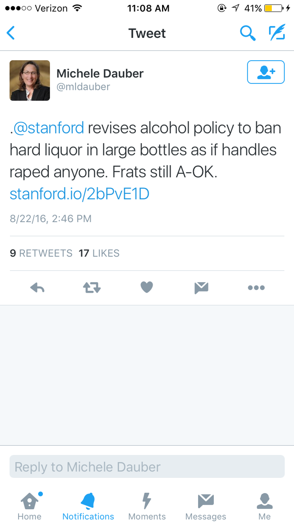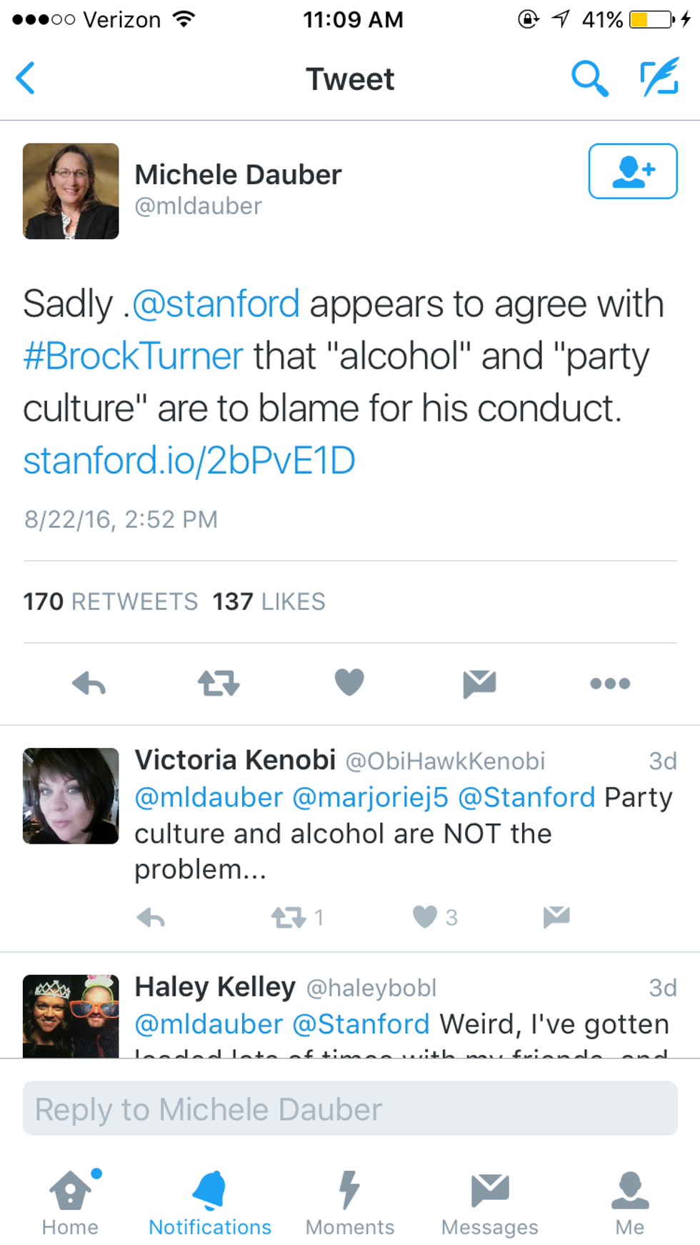 So instead of educating the student population about binge drinking and the repercussions of it they are just going to "take away" all of the more "dangerous" alcohol. This will not help. This seems like an excuse of rule in response to the Brock Turner case. To me the University is blaming alcohol for their recent diminished reputation by the media. Alcohol must be the one to blame when 21, 22, or 23 year-old's make bad decisions, right? Wrong. The University was forced to take action. This is what they came up with; a sad excuse of a rule that will make no difference. I included some tweets below that responded to the fact that Stanford was basically saying that Brock Turner was not to blame and that alcohol was.
