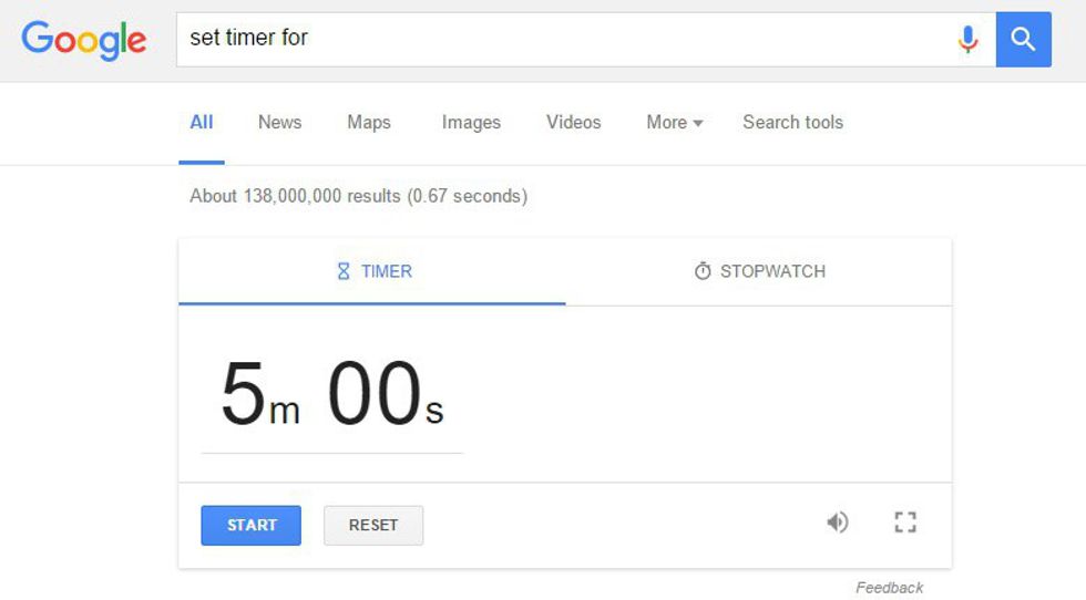 If your phone isn't handy and you need a timer or a stopwatch, Google is your new best friend. Simply input "set timer for" and then your desired time, or type in "stopwatch" and it'll come right up.