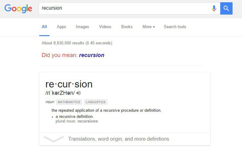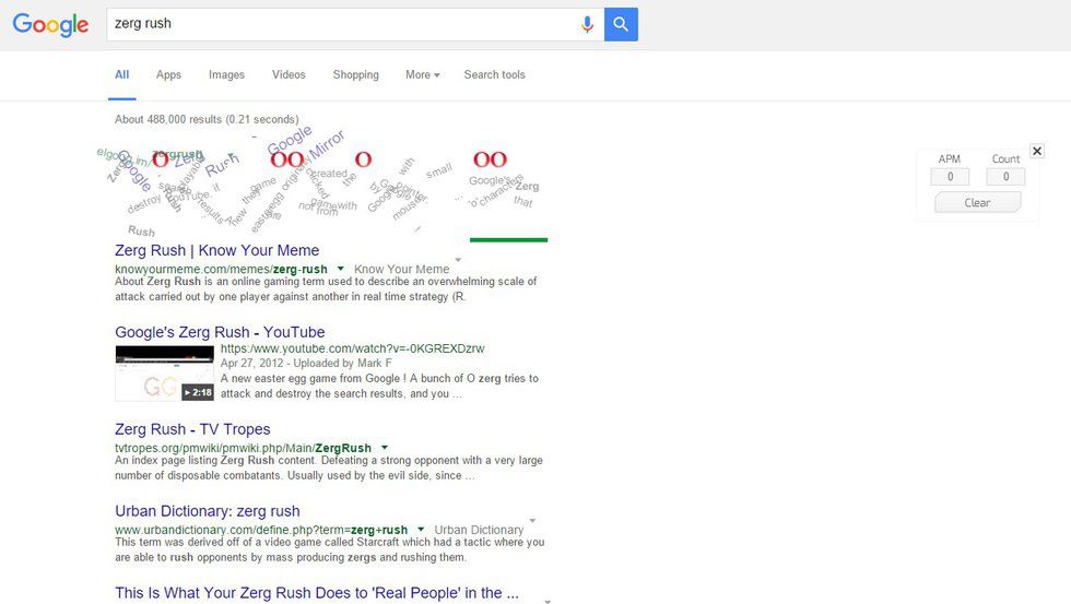 The gaming term "zerg rush" means that a player is being completely overwhelmed by a huge amount of weak enemies. To go along with that, Google was named after a googol, which is a number scientifically written as 1.0x10^100. Or, in simpler terms, it is the number one with 100 zeroes following it. So, when you go to Google and you type in zerg rush... be prepared to be overwhelmed...