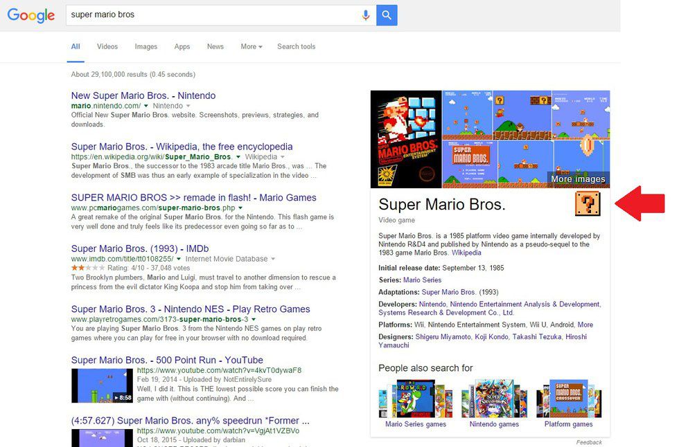 You know when Mario collects coins and it makes a sound? By typing in "Super Mario Bros" in the search bar, a wiki briefing will appear on the right side next to the search results. Inside the box however, will be a flashing question mark box, like the ones you see in the game. Click on it, collect coins!