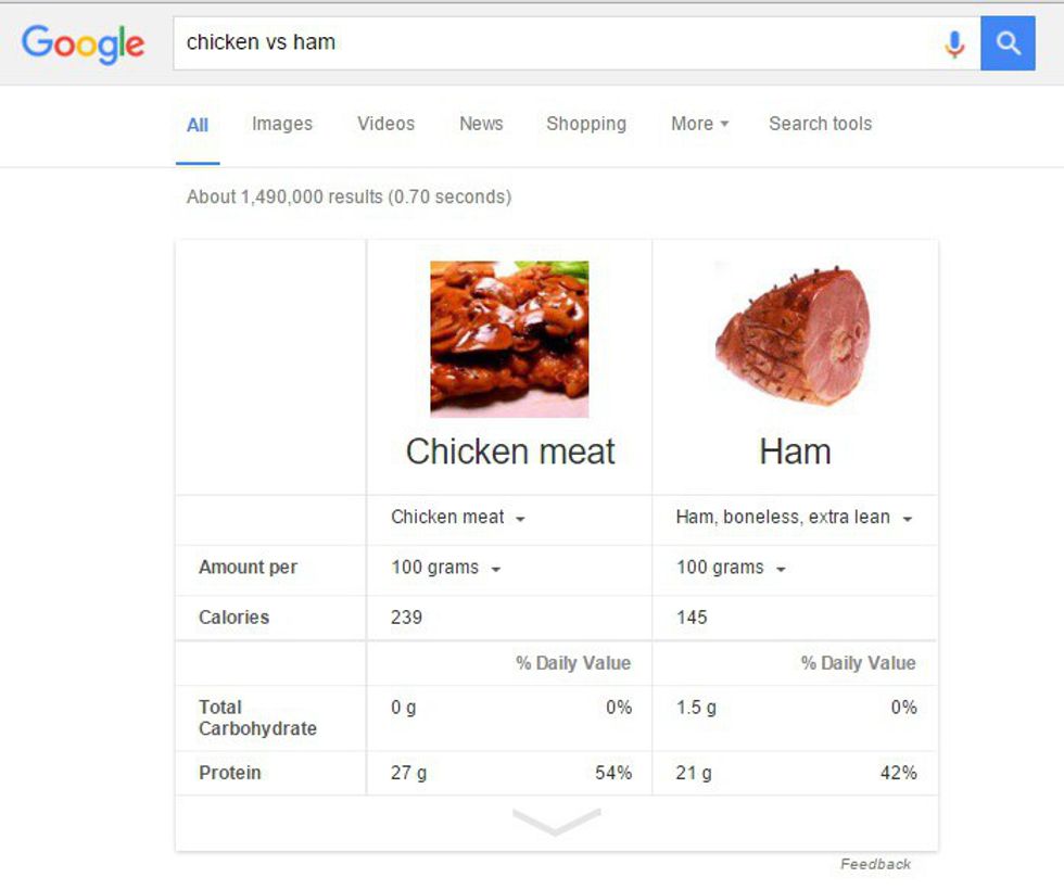 If you're struggling with wanting to eat what's best for you, and you want to know what has more calories, put in "chicken vs ham" (for example) and it'll tell you.