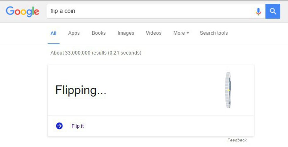 Need to make a quick decision but don't have a spare coin near you? Open up whatever browser app you use on your phone, go to Google, and type in "coin flip." It will automatically flip a coin, telling you whether it's heads or tails. Wanna do best two out of three? Hit the "flip it" button to do it again.