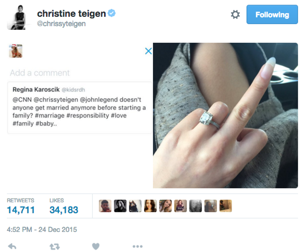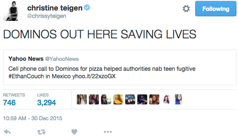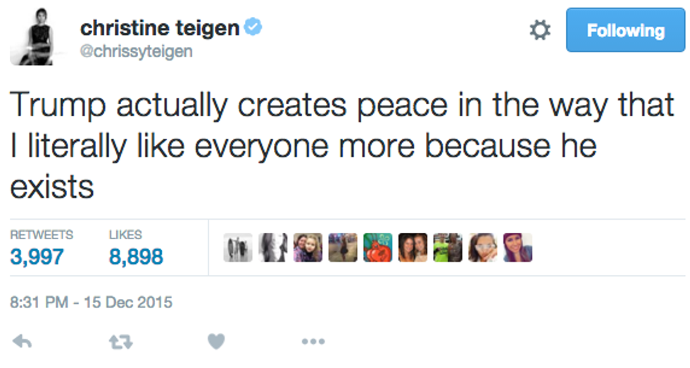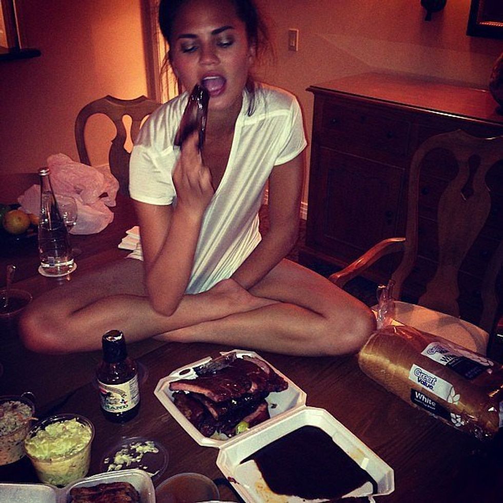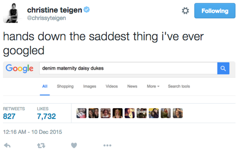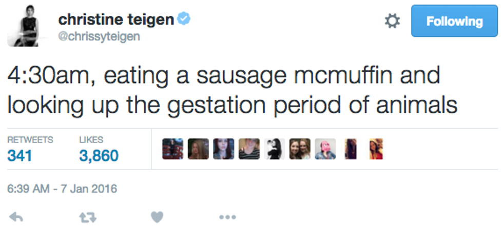 It's no secret that supermodel Chrissy Teigen is one of the most amazing and relatable celebrities out there. She posts unedited pictures, uses no filter, and is liberal as all get out. And not to mention she's married to John Legend and they're creating a beautiful human together. Although always humorous, Chrissy has become so undeniably funny and real since her and John's pregnancy announcement on October 12, 2015. Whether she's starving, or warding off Trump followers, she is ridiculously relatable, so here is a compilation of her X most relatable tweets since she announced she was having a baby.