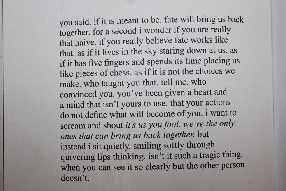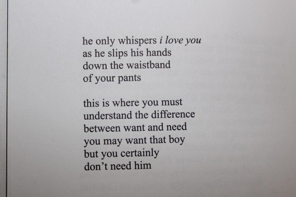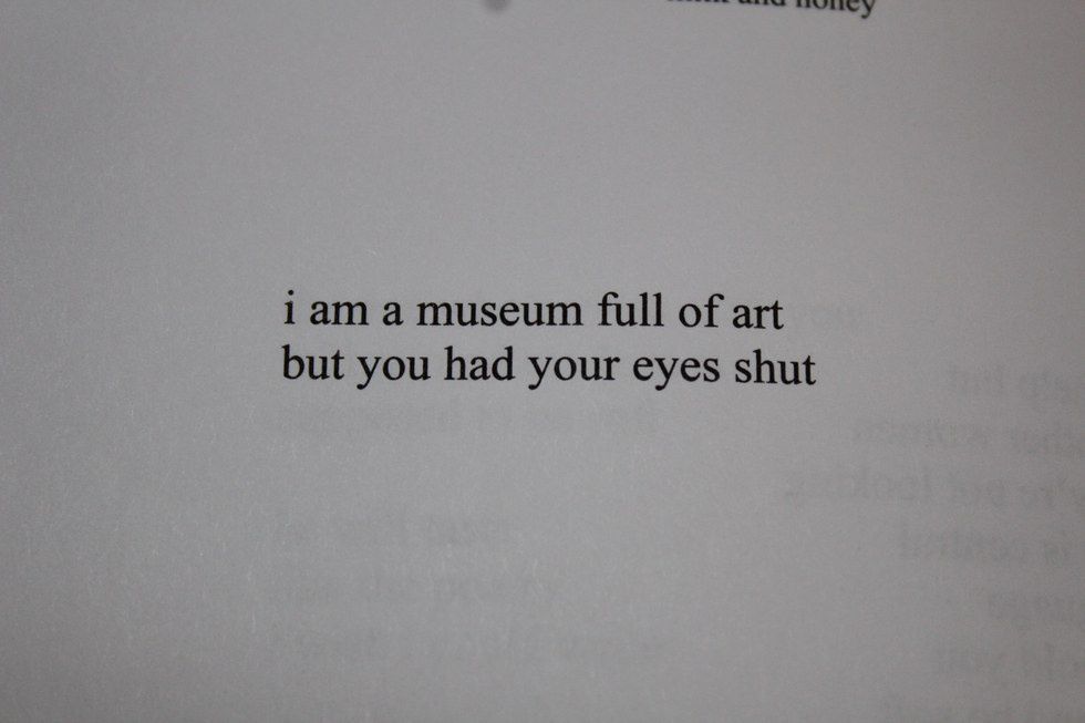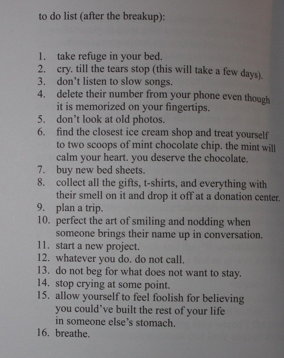 But instead of sinking deeper down into the water, go to a local bookstore and buy this amazing poetry book called Milk and Honey, because my God, I promise it’s worth it. Rupi Kaur is a poetess that has your whole heart (along with her own) bound up in the pages of this perfect creation. Your body will feel numb after the breakup has crashed upon you. And you’ll feel incredibly raw. But when you let your tired bones sink into your couch cushions as you curl up to read this book, you’ll start to see the light breaking through the surface of the water above you...and slowly but surely, you’ll swim up towards it.