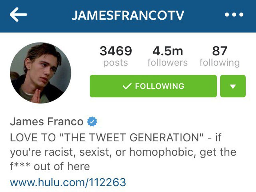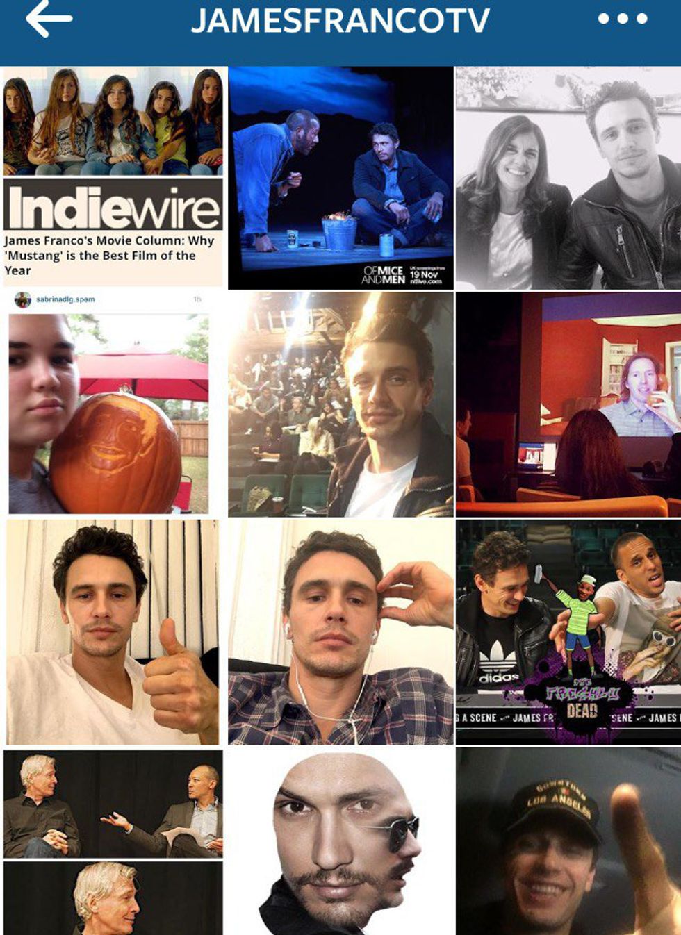 2. James Franco - Not only is he a great actor and a beautiful human being, but his Instagram displays his plethora of other talents such as writing, taking selfies with his nana, and painting nude pictures of Seth Rogan