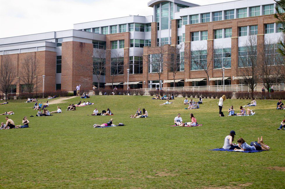 In early April, this is where you'll get your first sunburn of the year. Did you think going to class when it was cold was difficult? Try leaving your friends on this lawn.