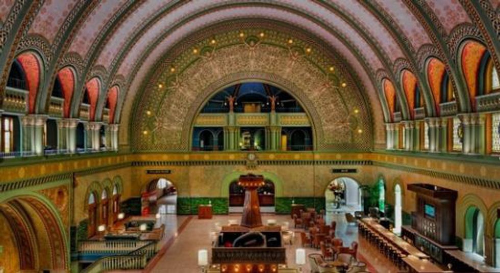 This arch was part of the original structure of Union Station. If two people face opposite corners and whisper, they will still be able to hear each other.
