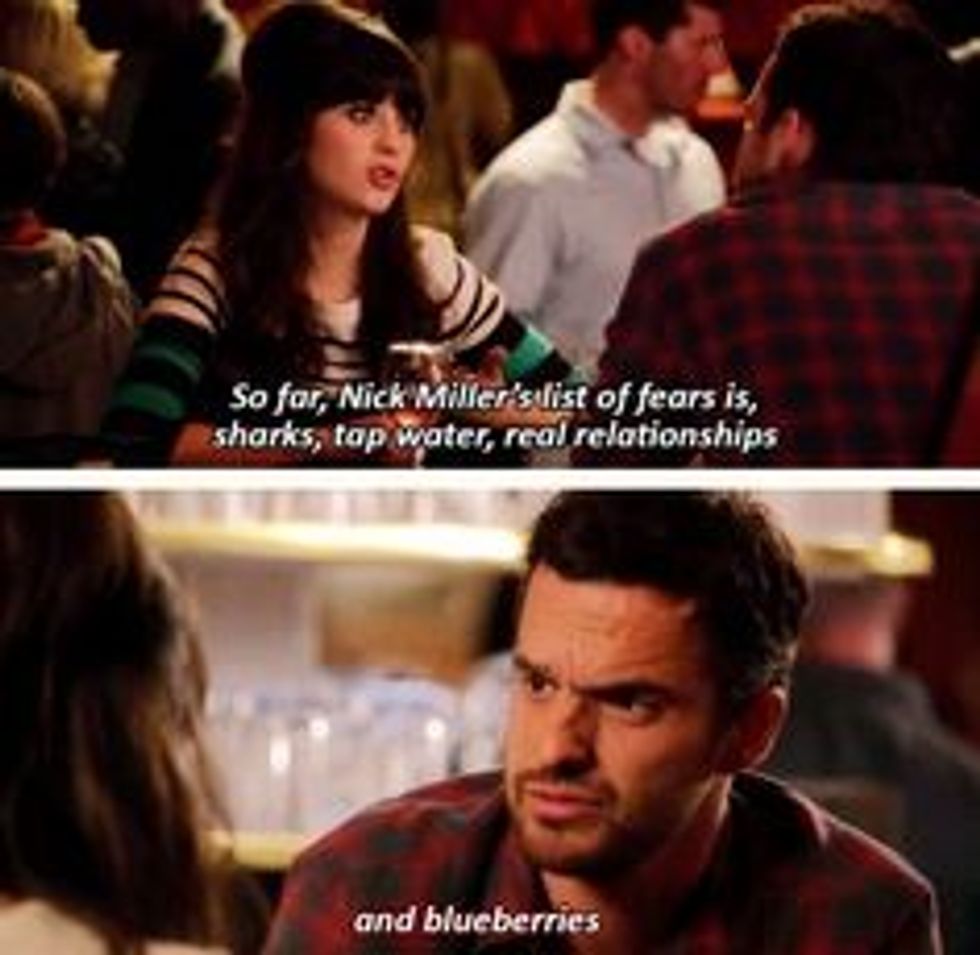 We all have fears, whether it's of heights, snakes, or spiders. We may think that some of our fears are ridiculous. Nick Miller is afraid of blueberries, and he doesn't care. We shouldn't let our fears bother us.
