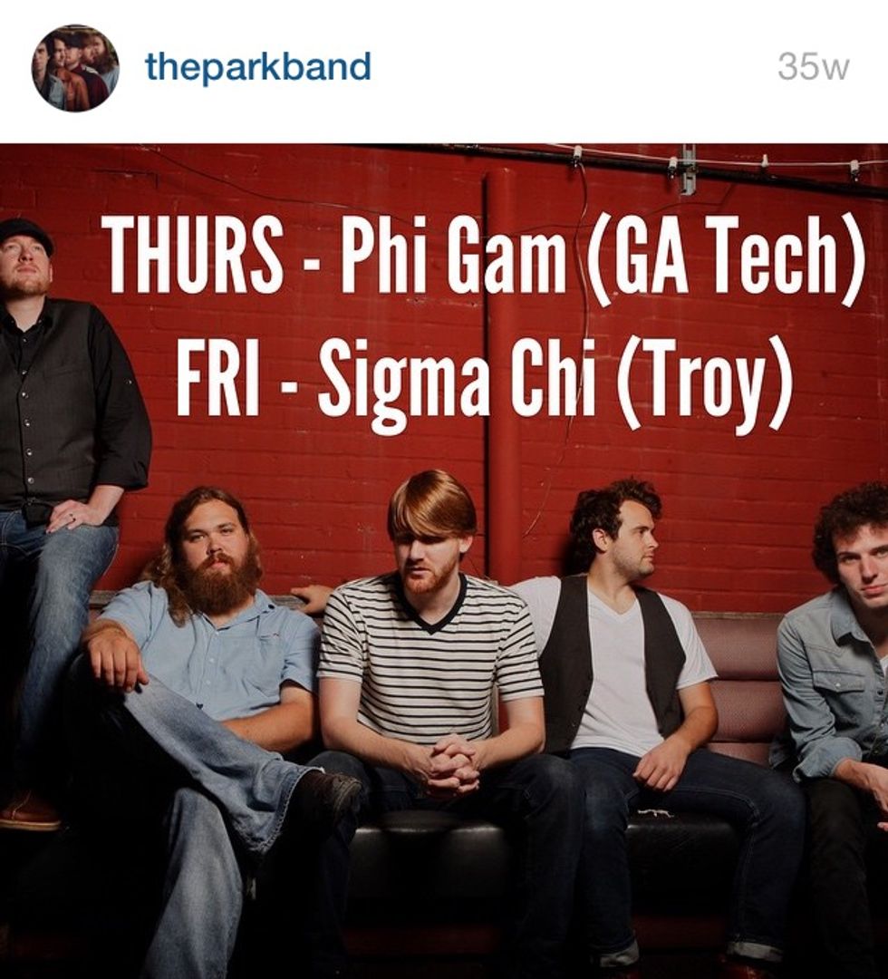 Park Band, Trotline, Blackberry Breeze, U.S. Band, Charlie Muncaster, Kane Meredith and Neil Clayton Band can be found on any odd night either at Sigma Chi, Lambda Chi or The Porch. You can almost guarantee that there will be a "Dixieland Delight" or a "Don't Stop Believin'" played sometime throughout the night.