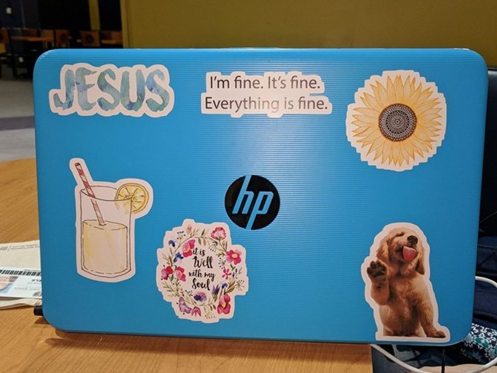 I have a glass of lemonade, a golden retriever, a sunflower, Jesus, "I'm fine. It's Fine. Everything is fine.", "It is well with my soul" inside a ring of flowers, and "breathe" on my laptop and I love them.