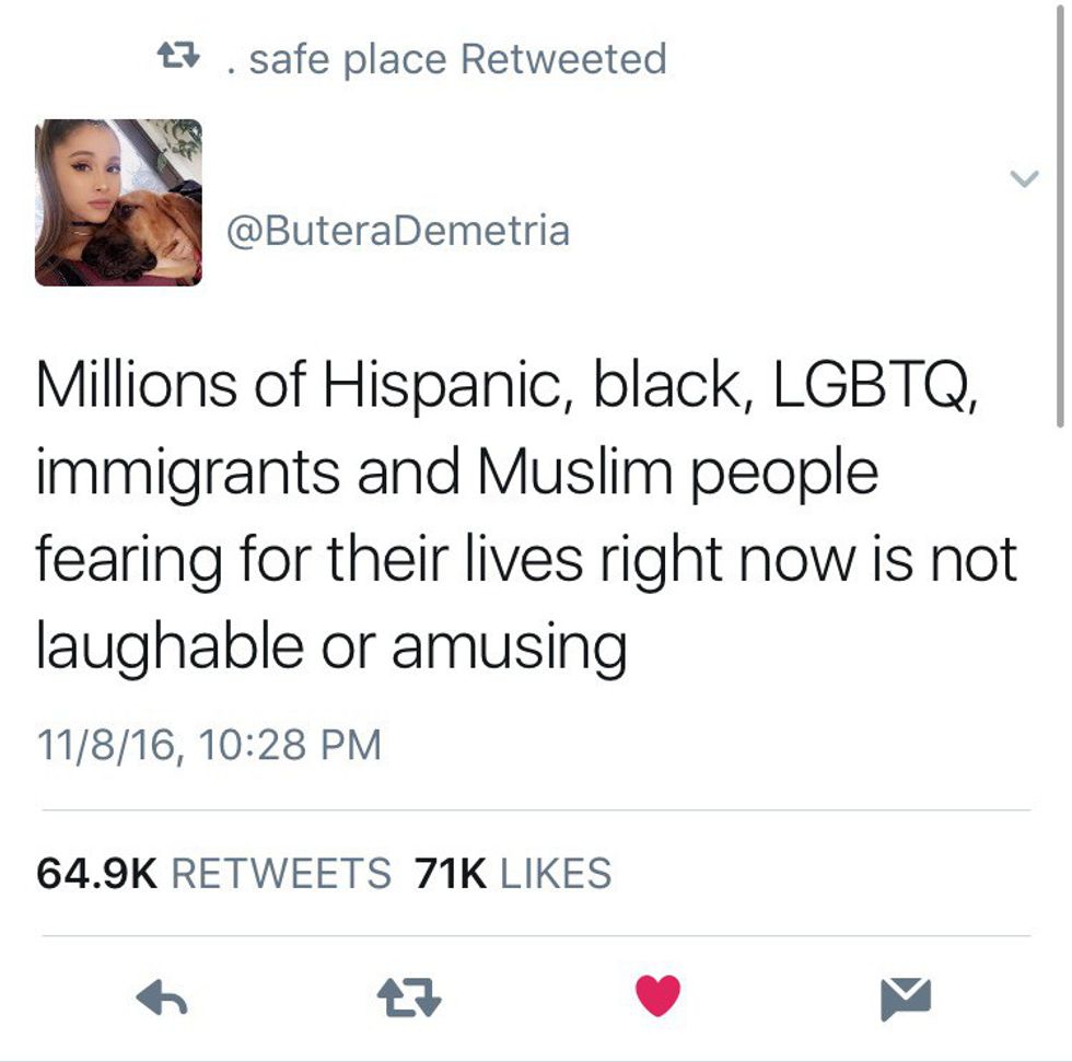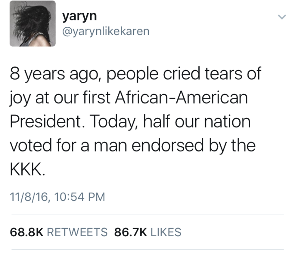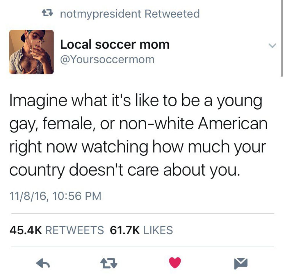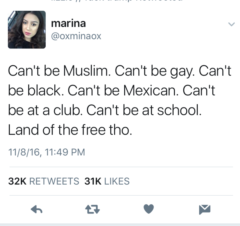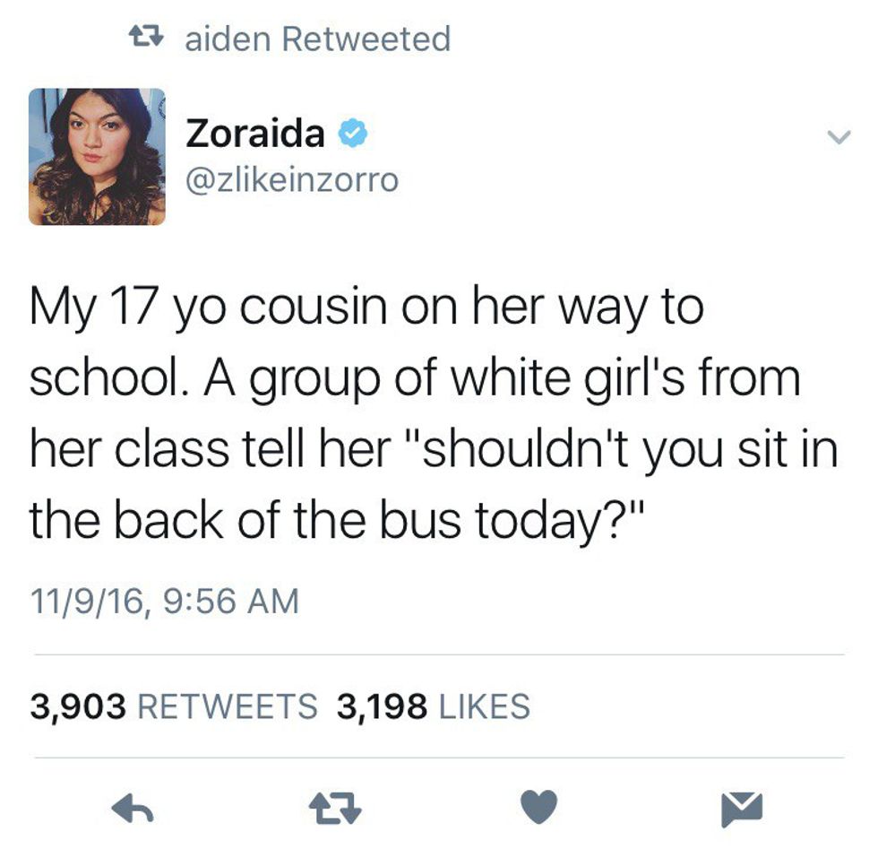 There are so many more stories of things like this happening all around the country. (Over 200 incidents have been reported, and that number grows by the second). Even if Trump doesn't manage to accomplish anything he has promised his supporters, he has already done so much bad by bringing this hate to light. He's making us take a few steps back as a country and that just isn't right. We have the right to be scared for our future, and we should be.