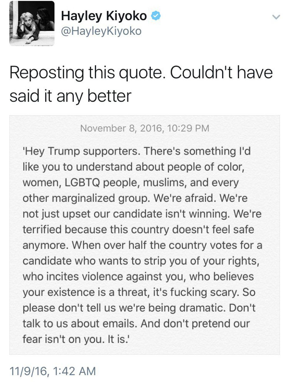 21. No one should ever have to think this way, especially due to the results of a presidential election.