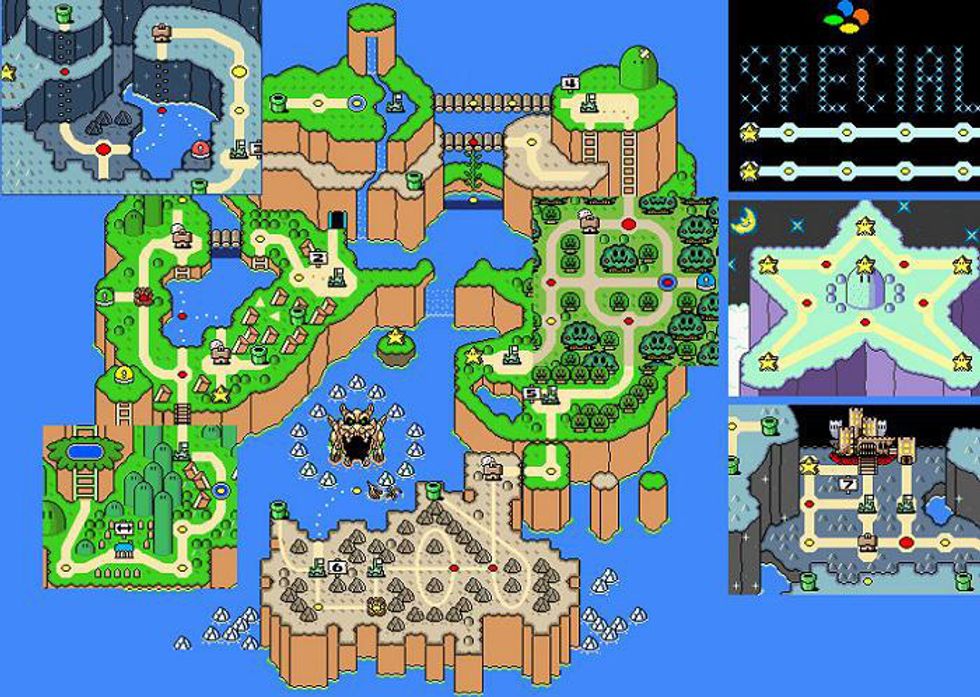 Take a glance at this overworld map, if you've never seen it before. The first image is the general overview, while the second image displays levels not immediately shown and secret worlds (Star World and the Special World) as well as a few more details like the entrances to Star World. Unlike its predecessors or later installments, "Super Mario World's" overworld was connected as one large world map, rather than separate worlds traveled between during a moment where the screen goes black.