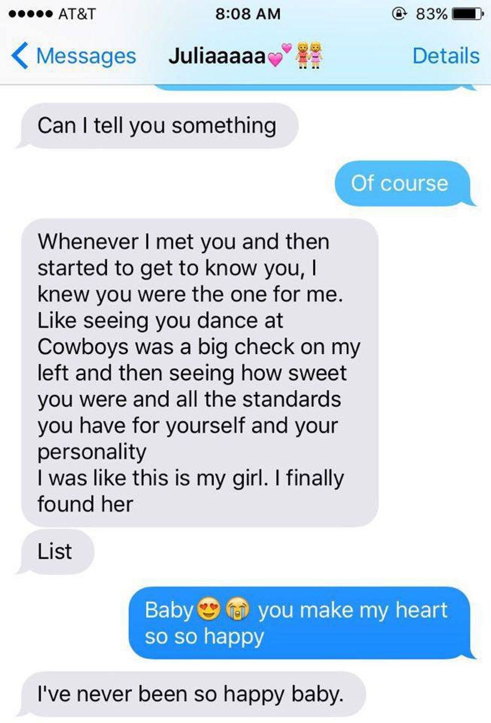 "You're amazing babe you make me the happiest girl alive and so proud to call you mine. No matter what you want to do in life i support you 100% I'm happy to see how far we've come and I hope to see us to far in life together." -Saige and Savannah, 20, together 10 months
