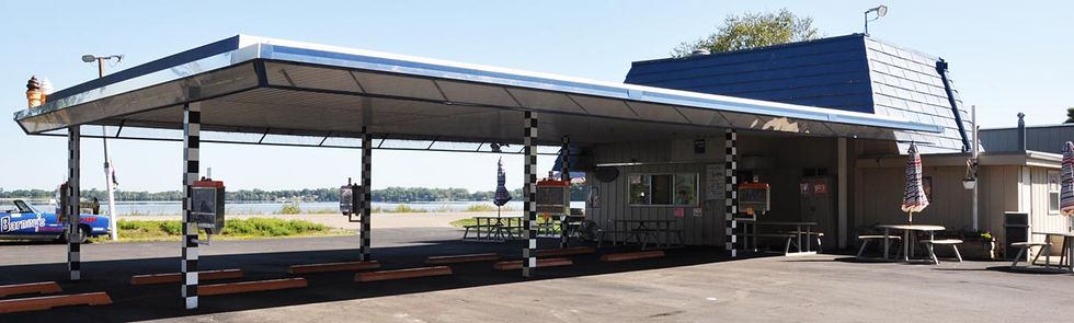 A true blast from the past, this 1950's style drive-in dinner is the perfect place to treat yourself to a burger, fries, and an old fashioned root beer float.