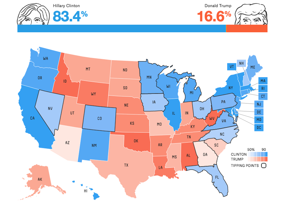 Nate's polls-only model shows Clinton having a 83.4 percent chance of becoming the 45th President of the United States, based on where the polls are right now. He predicts Clinton will win 353 electoral votes, and Trump will win 185.