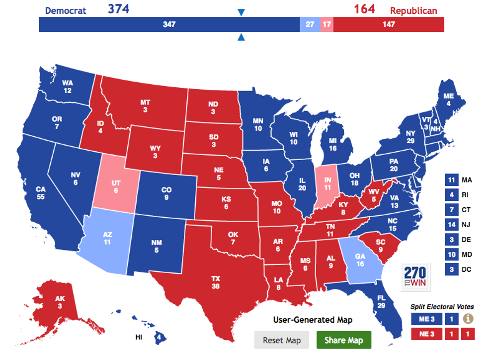 I'm not 100% convinced this is what the map will look like in November. However, based on recent polling and personal opinion, I've put together what I think it could look like. The lighter colored states are ones that are just leaning towards the respective parties. A recent poll in Georgia actually shows Hillary Clinton ahead of Donald Trump, which is a real surprise considering how red it normally is. Arizona also has the potential to go for Clinton, especially due to the large Hispanic population in the state. I have Indiana and Utah slightly leaning towards Trump for now. Indiana went for Obama in 2008, but switched to Romney in 2012, meaning it could go either way. I give Donald Trump the slight advantage in the state, because that's where his running mate is from. Utah is normally a pretty solid Republican state, but the large population of Mormons in the state and Trump's continued attacks on Mitt Romney have made the state less of a sure thing.