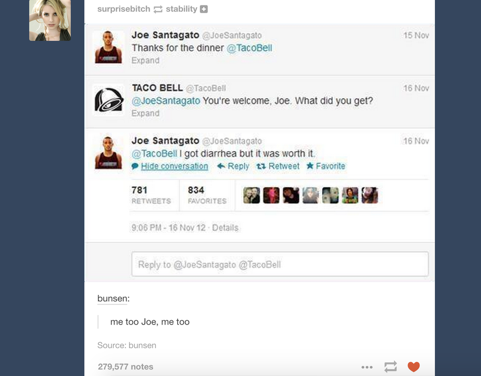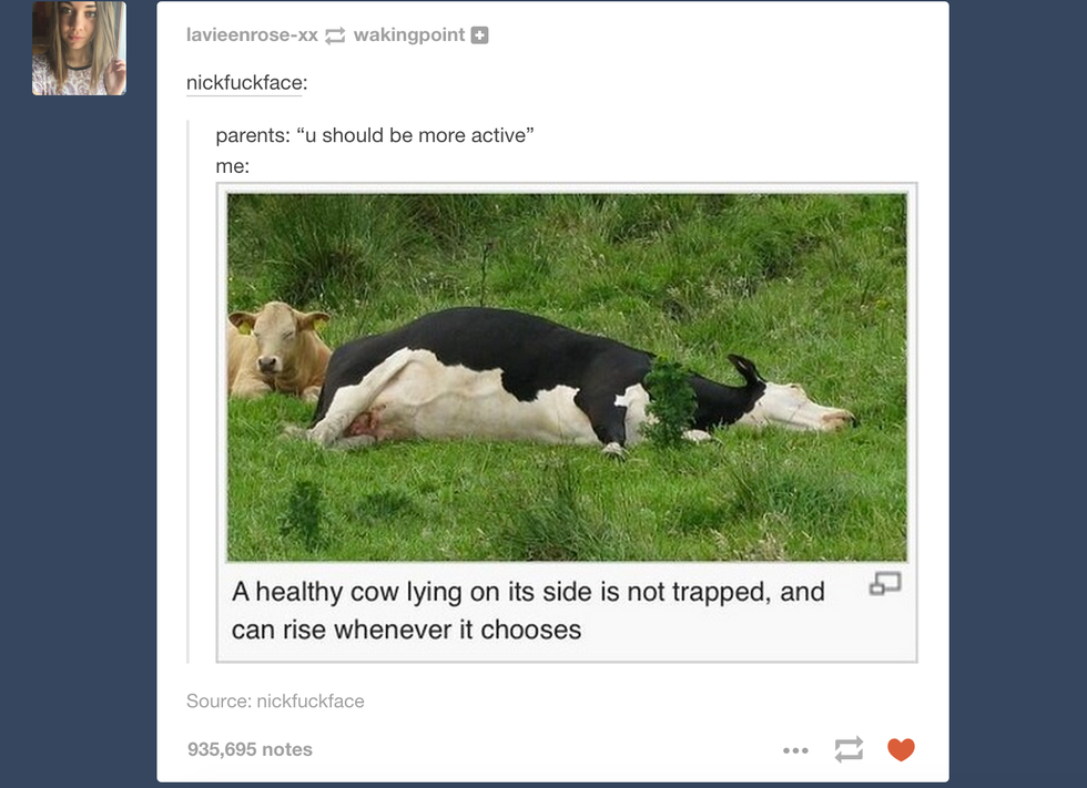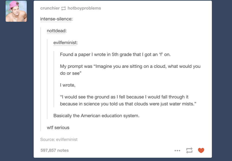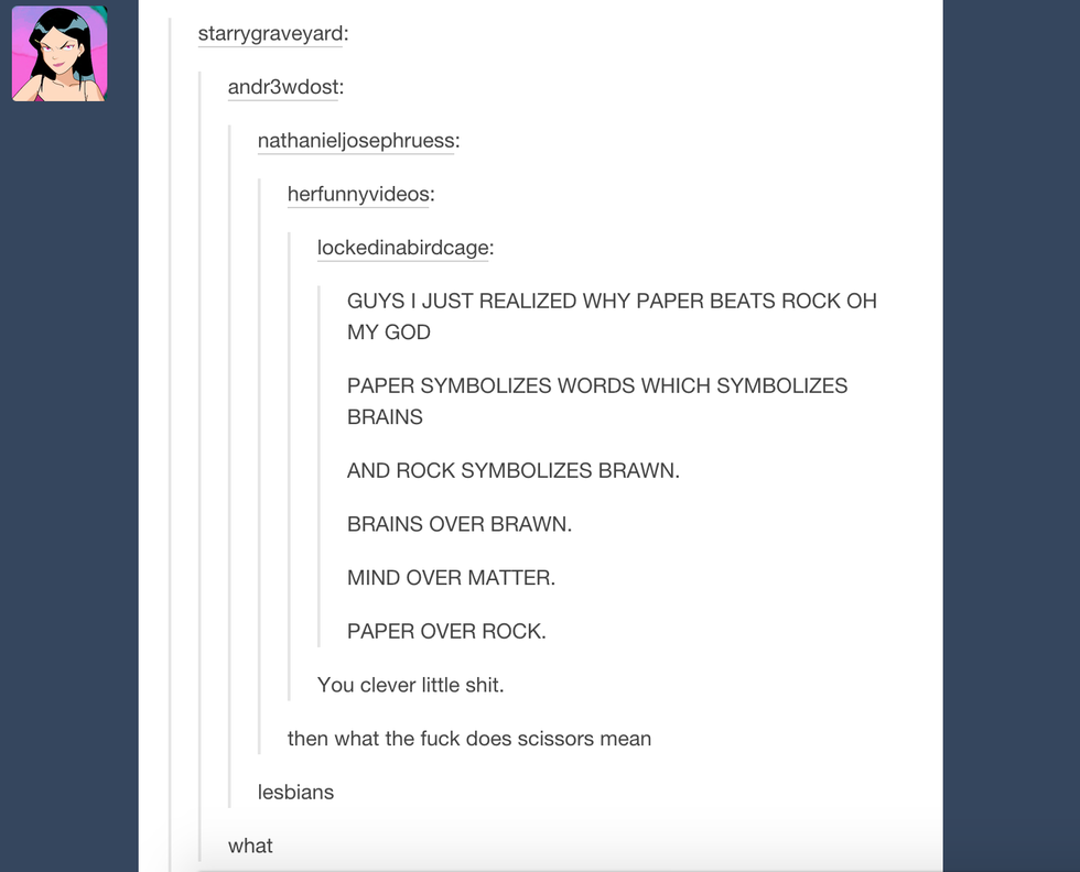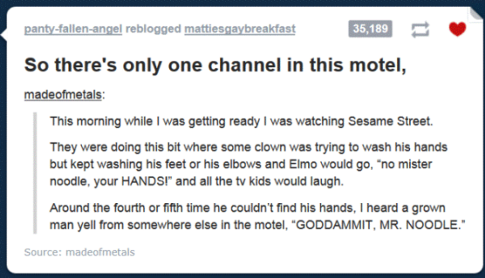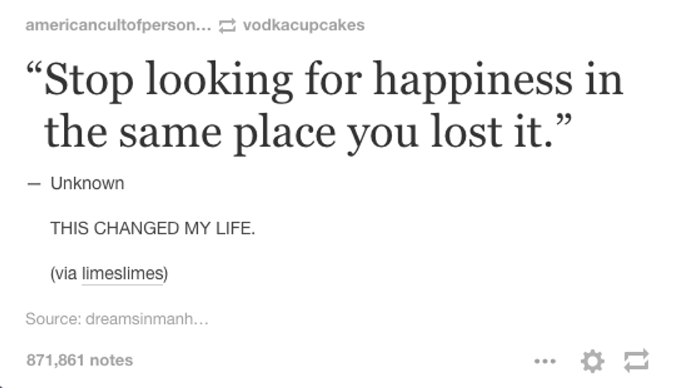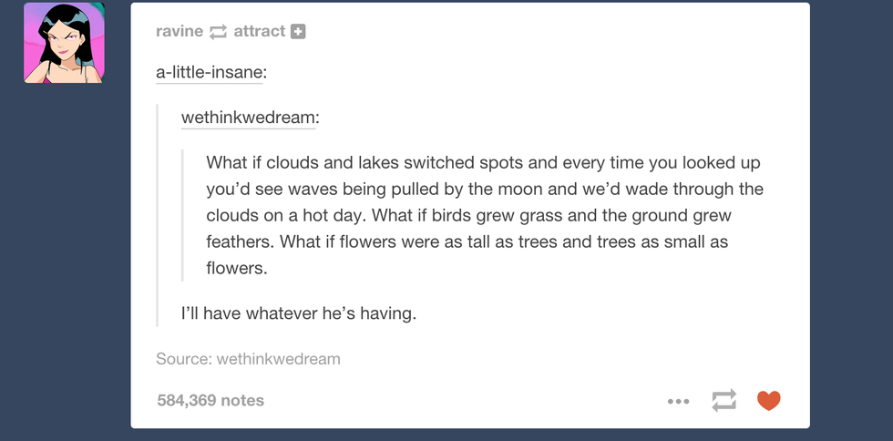 Tumblr is the place of expansive knowledge, creativity, humor, and important life lessons. If you have not heard of Tumblr you probably have never used the Internet or you live under a rock -- or both. I would just like to share a piece of the amazing experience that is tumblr.com. Whatever you need in life, Tumblr will be there to see you through. Enjoy!