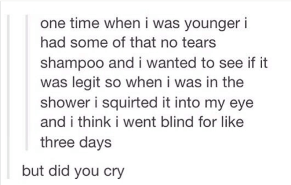 22. No tears shampoo -- the greatest lie in mankind's history.