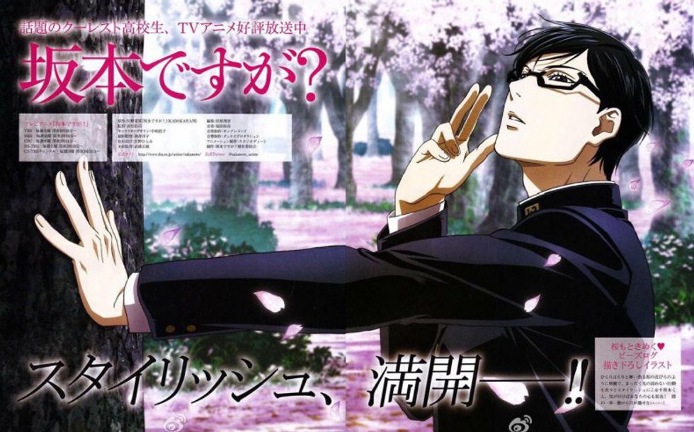 To round off this short recommendations list, I present: Sakamoto desu ga? (Haven't You Heard? I'm Sakamoto). This anime is best described as absurdist comedy, and it is very off-the-wall. The star of the show is, of course, Sakamoto- a high school student who is stylish in everything he does. He's so cool and stylish that all the girls love him, and many of his male classmates and upperclassmen desperately want to out-do and one-up him. He's always one step ahead of everyone, and all of his absurd and breathtakingly stylish actions have a purpose- usually revealed at the end of a skit in a very Oh Henry manner.