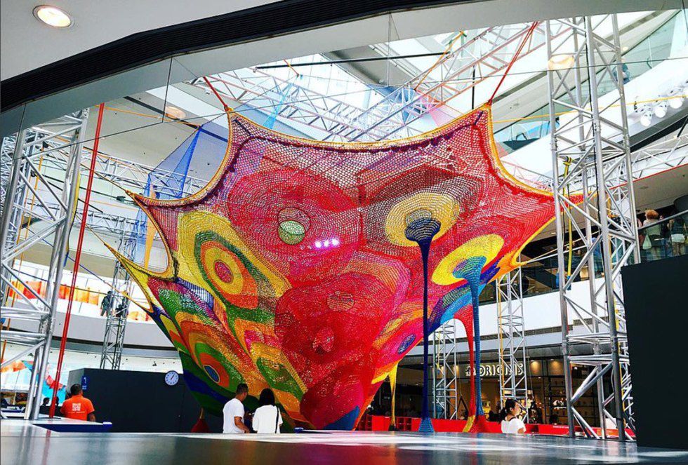 This is a random interactive art installation that we found at a shopping mall. People who signed up ahead of time can crawl up and around the woven net and slide down the woven funnels. I still haven't been able to identify it or it's artist, but we envied the people climbing around in the woven strands.