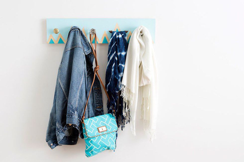 The key to a clean room is to make sure everything is off the floor! An easy and cheap way of keeping the small space neat and organize is a coat rack, which can be used for various items such as keys, coats/jackets, backpacks, umbrellas, bathrobes, towels, and hats. You can make it in no less than 15 minutes! Here is how. The materials you will need include: wood (5/8 inch thick), Black Mat Square Knob, Gold Knob, Clear Crystal Knob, Bronze Handle, paint, tape, paint brushes, scissors, drill and a Philips head screw driver. How to make: First, measure the space you want your coat rack and cut your wood to size. The hardware store can do this for you if you want an exact measurement, or you can just buy a small wood plank. I’d recommend the wood be about 5/8 inch thick. Second, tape on a design and paint the wood. Third, after the paint is dry layout your knobs and handles, drill holes in your wood board and then screw in your knobs and handles. And lastly, hang your rack on the wall and you are good to go. Please note that you are more than welcome to pick out your own knobs!!