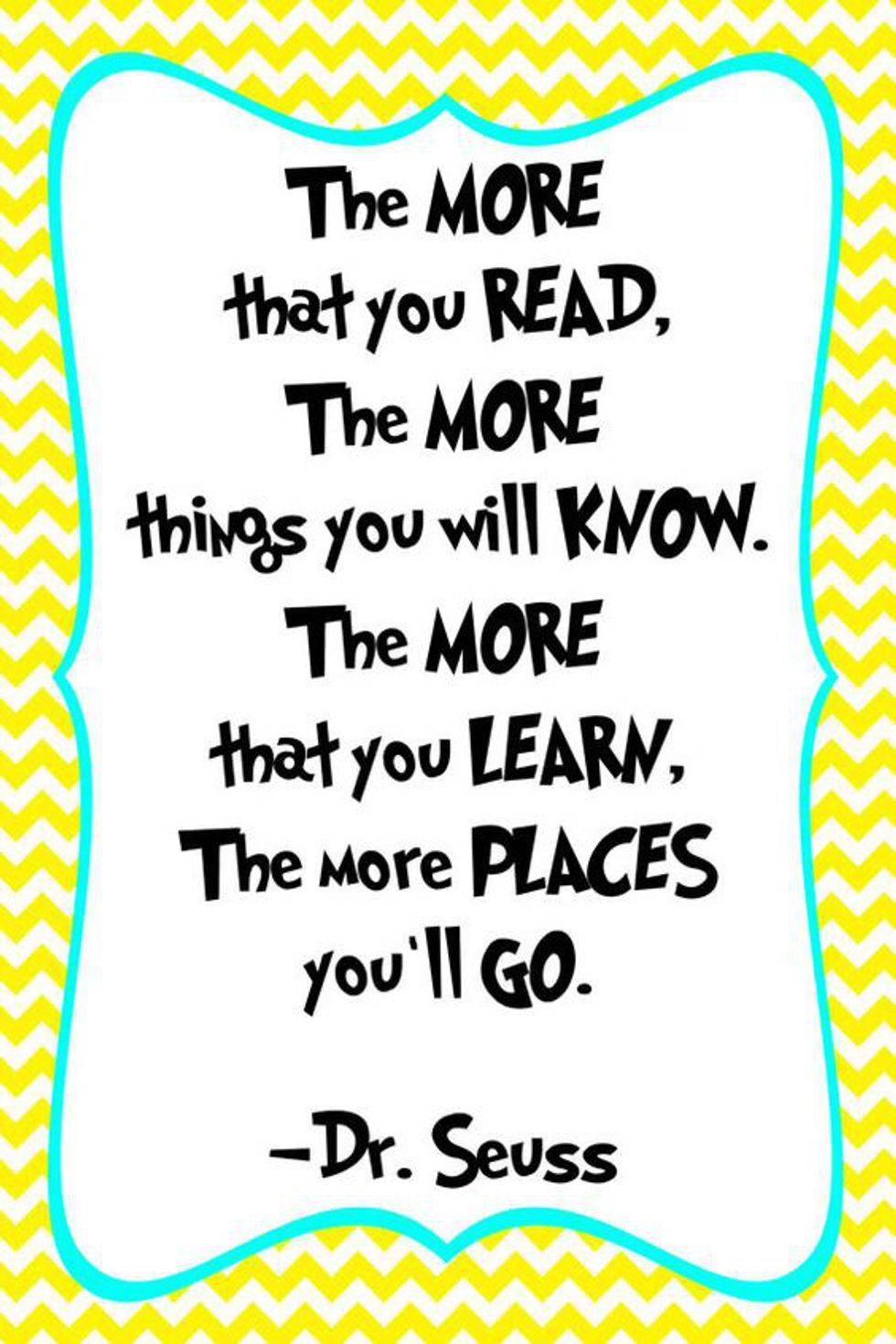This is the perfect example of why everyone should put a little more effort into bettering and educating themselves. You don’t have to be in college to learn things. Life is full of educational moments if you keep an eye open. One of these educational moments could be as simple as looking up home remedies for a cold if you’re on your own for the first time and don’t want to call home just to have your mother worry about you over the phone. Another could be a bit more complex, like taking a class to become CPR certified. If you’re in college, you can learn how to quickly memorize the $200 textbook that you only needed for one passage because you have finals the next day. See? Plenty of opportunity! The important part of this quote though, is the part that states: “The more you’ll learn, the more places you’ll go.” Everything that happens to you in life, whether good or bad, helps to shape you as a person. You either learn a lesson you didn’t know you needed, or you become more open-minded about the world around you. Even if you don’t travel as the quote implies, you go much farther intellectually than others who don’t take the time to try to better themselves and that is important to keep in mind.
