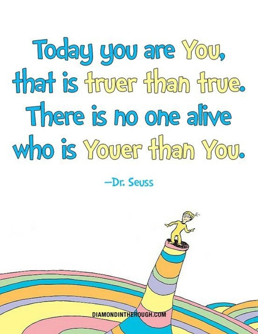 This last quote is, perhaps, the most important one to remember. There are millions of people in the world but there is only one of you. You are unique, special, and beautiful in a way that is entirely your own. Everyone should keep this in mind. We all have our own talents and flaws, and we should embrace every single one of them. You should never try to be exactly like someone else. There’s already a person like that, but there's none like you. Be a bagel on a plate full of onion rings, a raisin oatmeal cookie on a plate of chocolate chips, a fruit loop in a bowl of cheerios! Don’t be afraid to stand out. Be different! Show the world that you deserve attention just as you are. There’s nothing for you to be ashamed of. Be the very best you that you can be because you are perfect the way you are and no one should make you feel otherwise. No one, indeed, is youer than you!