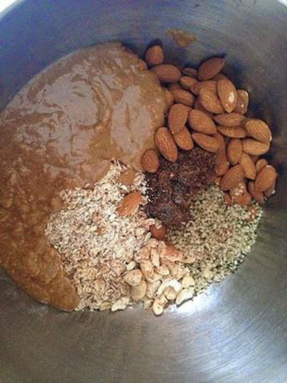 - Place toasted oats, almonds, hemp seeds, and dates into a bowl for later.