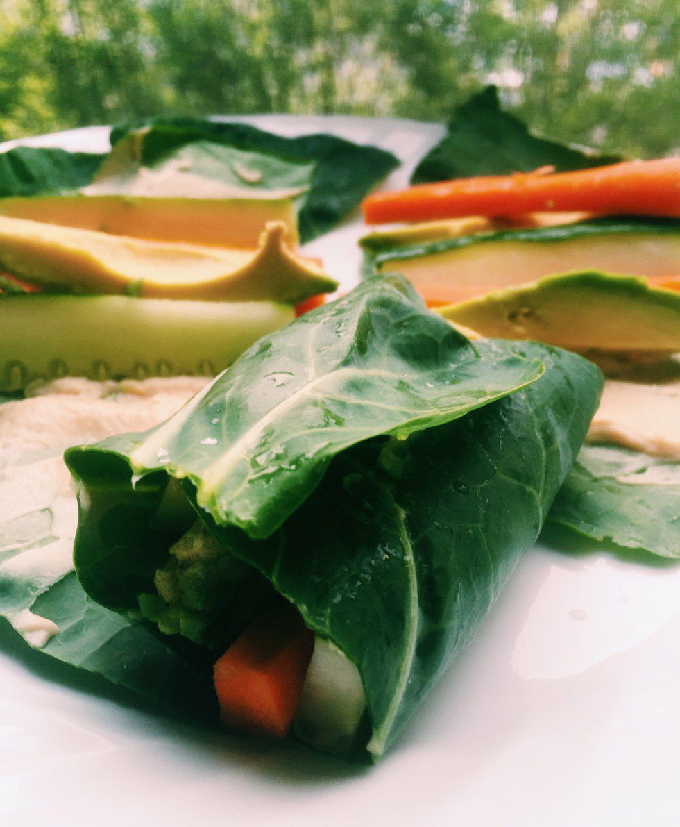 Wash the collard green leaves, remove the stem in the middle, and cut the collard green in half. Spread hummus over the leaf, and add as many veggies as you would like! Voila!