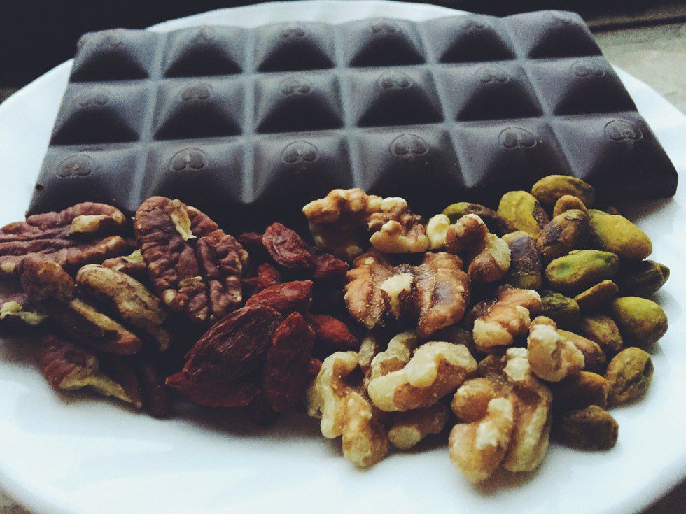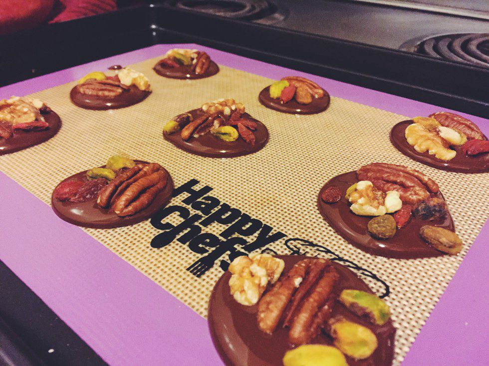 Dollop the chocolate onto wax paper (or a baking mat) and top with nuts and fruit. Put in the freezer for at least two to three hours and then enjoy!