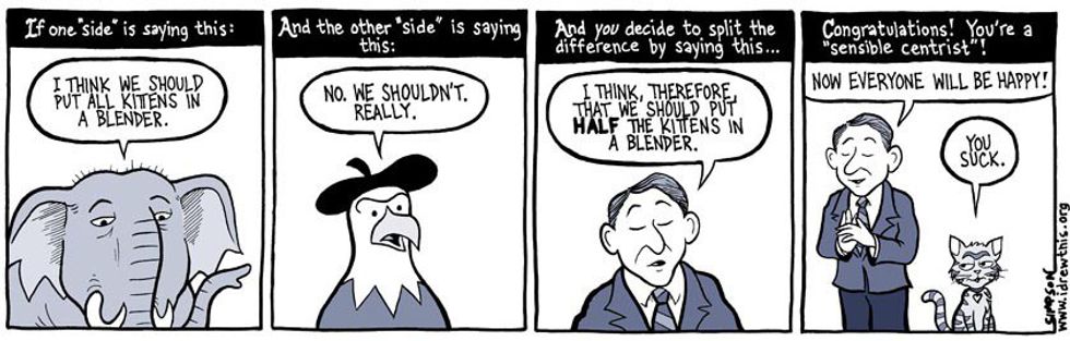 This kind of thinking breaks down so quickly once you begin to apply any kind of critical thought to it. "Slavery is wrong!" - "Slavery is great!" and in the middle-ground is: "Slavery is okay sometimes?" Some things aren't up to opinion. Some things are completely wrong and unacceptable, and we should be able to see and accept that.