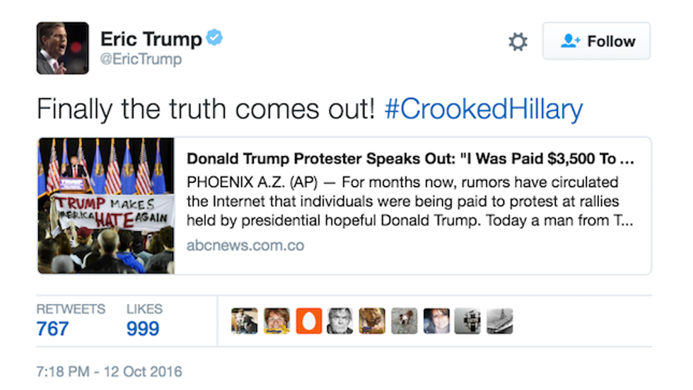 Eric Trump shared a news story seemingly produced by ABC News on his respective Twitter accounts claiming people were being paid $3,500 to protest Trump rallies during his 2016 campaign for President. Eric shared the story with the caption, "Finally the truth comes out! #CrookedHilary."
