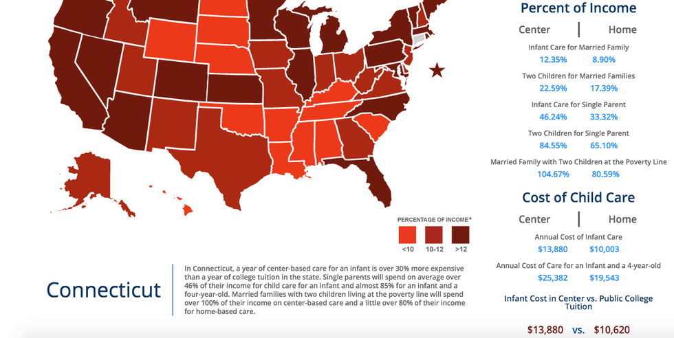 Having a child is expensive, and for those families that have two working parents, the price of quality daycare is outrageous. The average cost of annual daycare is often priced more than in-state tuition for college. Just look at the costs for Connecticut: