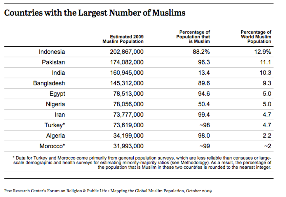 As you can clearly see in the data table below, Pew Research Center lists the the top ten countries with the largest numbers of Muslims.
