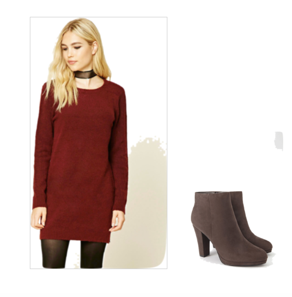 You're not doing Thanksgiving right if you don't wear the color burgundy. So, that being said, incorporate burgundy into a nice sweater dress. This look is so fast and easy to pull off, but you'll look like you spent hours getting dressed. Just make sure you have (or buy) some high heel booties to top off this look.